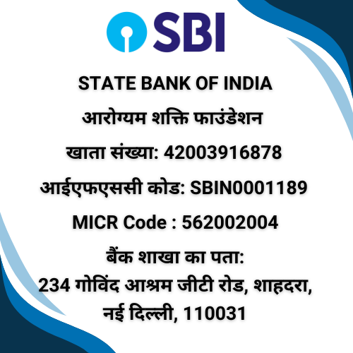 आपका योगदान आरोग्यम शक्ति फाउंडेशन के स्वास्थ्य, शिक्षा और सामाजिक उत्थान के कार्य को सशक्त बनाता है। हर छोटा या बड़ा दान एक बड़ा फर्क डालता है!